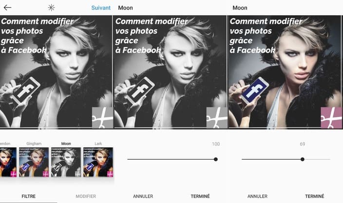 Une fois que vous avez choisi un filtre qui vous convient, vous avez la possibilité de régler son intensité. Il vous suffit de cliquer une deuxième fois sur le filtre choisi, en bas de l’écran, et une règle d’intensité s’affiche. N’oubliez pas d’appuyer sur terminé.