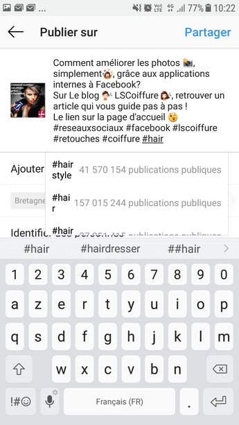 Sur cette publication, à la fin de mon texte, j’utilise le #hair. Vous pouvez voir apparaître, lorsque vous écrivez le mot, une liste déroulante. Choisissez le terme qui possède le plus de publications publiques, afin que votre publication circule le plus possible.