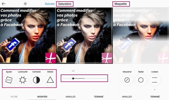 Choisissez ce que vous souhaitez modifier et testez. Vous pouvez annuler ou revenir dessus par la suite. En ce qui concerne le flou, il faut pincer l’image pour régler l’intensité et la position du floutage.
