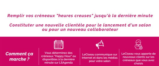 Grâce au partenariat entre LSCoiffure et LeCiseau, il vous suffit aujourd’hui d’indiquer directement sur votre agenda LSCoiffure, les créneaux d’heures creuses que vous aimeriez faire remplir par LeCiseau, qui s’occupera du reste.