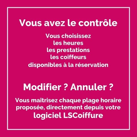 Vous avez le contrôle. Vous avez la possibilité de choisir les heures, mais aussi les prestations et définir les coiffeurs disponibles à la réservation. Vous pouvez maîtriser chaque plage horaire proposée en les modifiant, ou même en les annulant, directement depuis votre logiciel LSCoiffure.